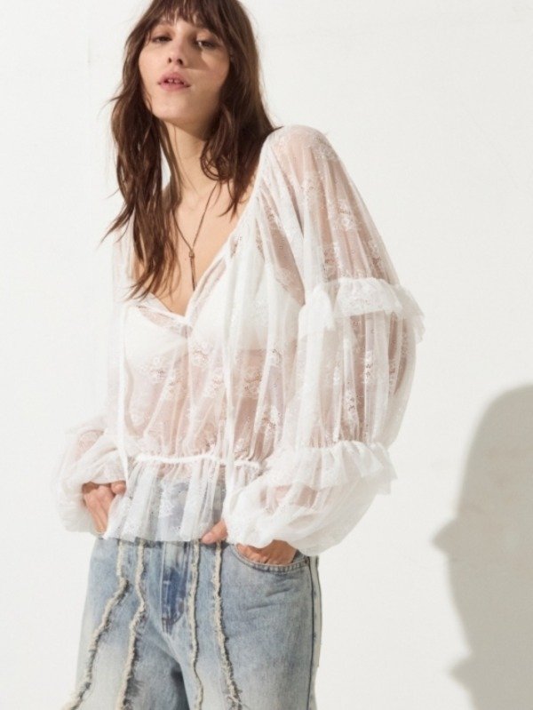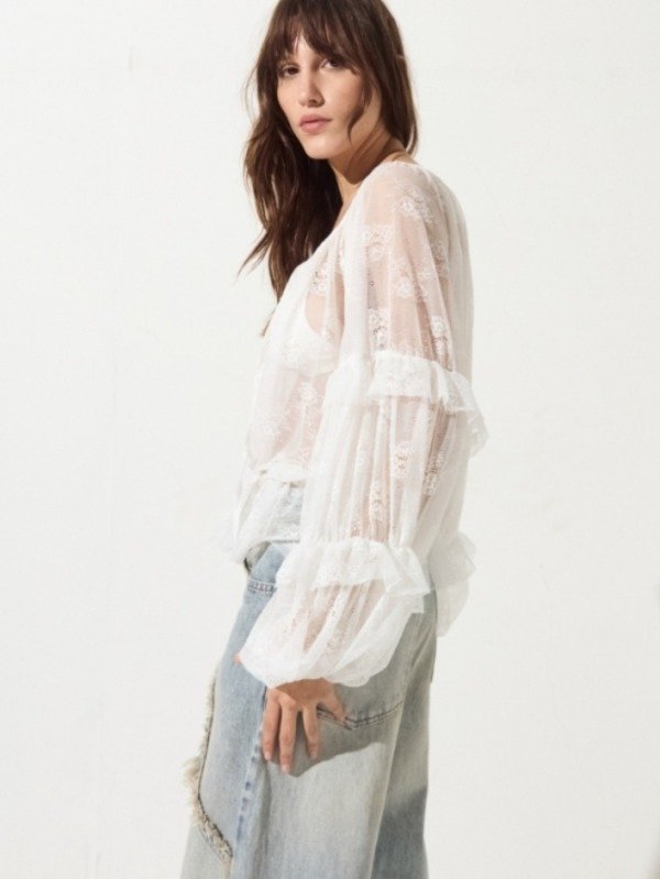Blusa de encaje, cuello redondo con lazo en escote y detalle de volados en mangas