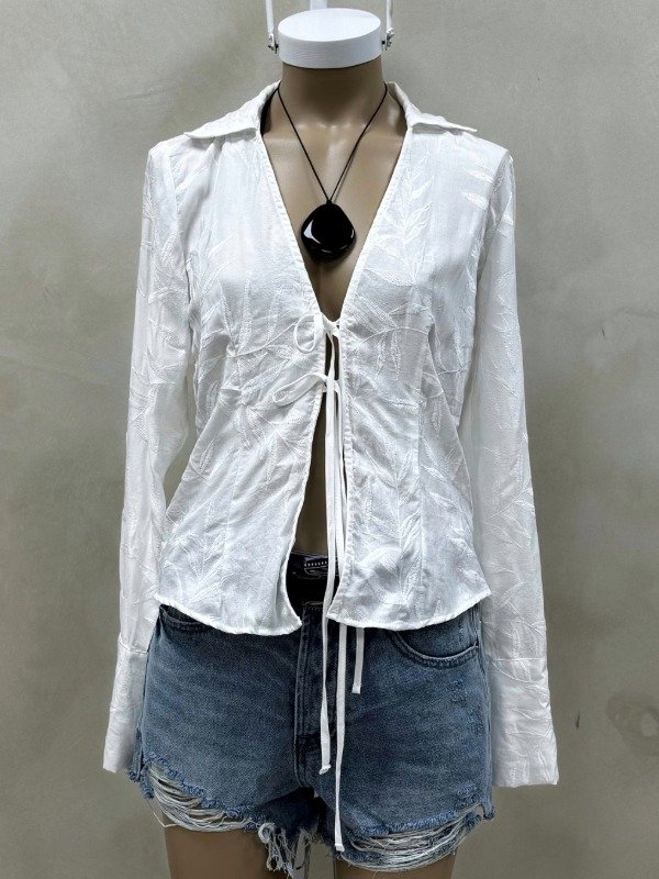 Blusa manga larga escote en V con cuello. Puños anchos con botones y cordones de la misma tela en el delantero. Delantero y espalda con pinzas de entalle. Confeccionada en algodón, variante blanca con bordado de hojas a tono.
