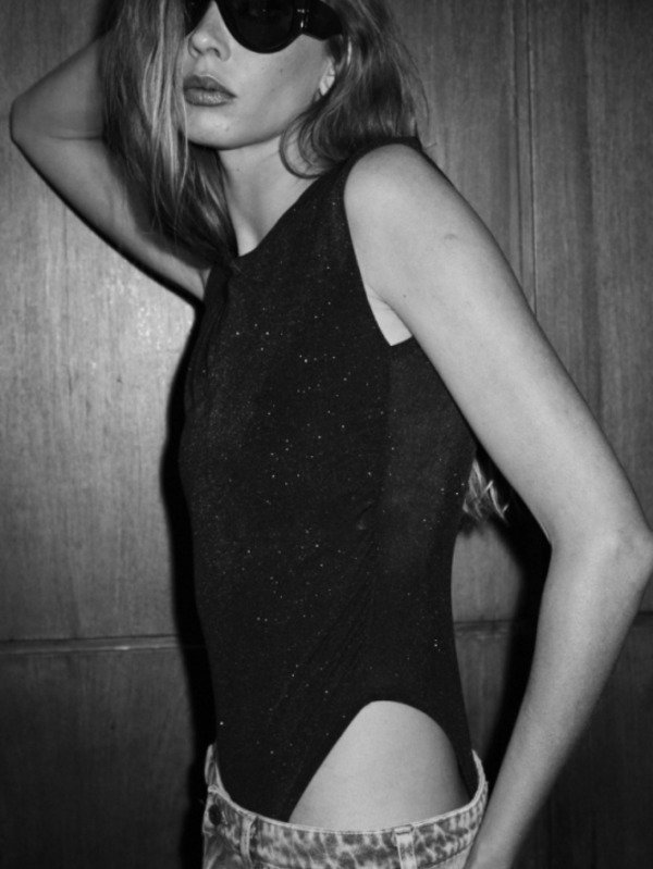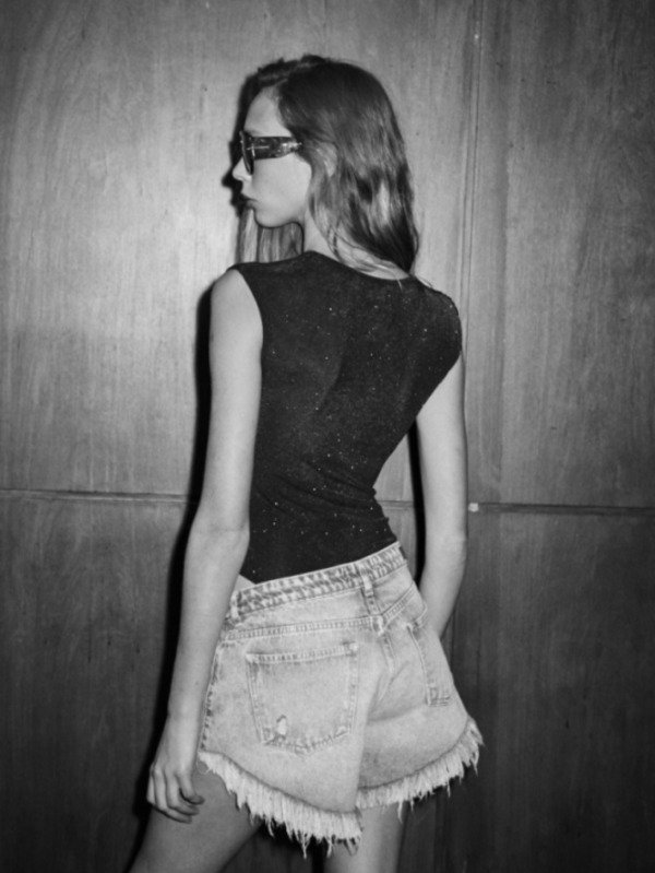 Body escote redondo, con laterales fruncidos. Confeccionado en tela glitter, con abertura en entrepierna mediante broches snaps metálicos .