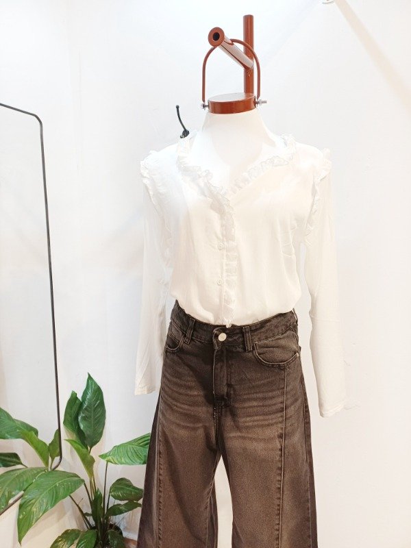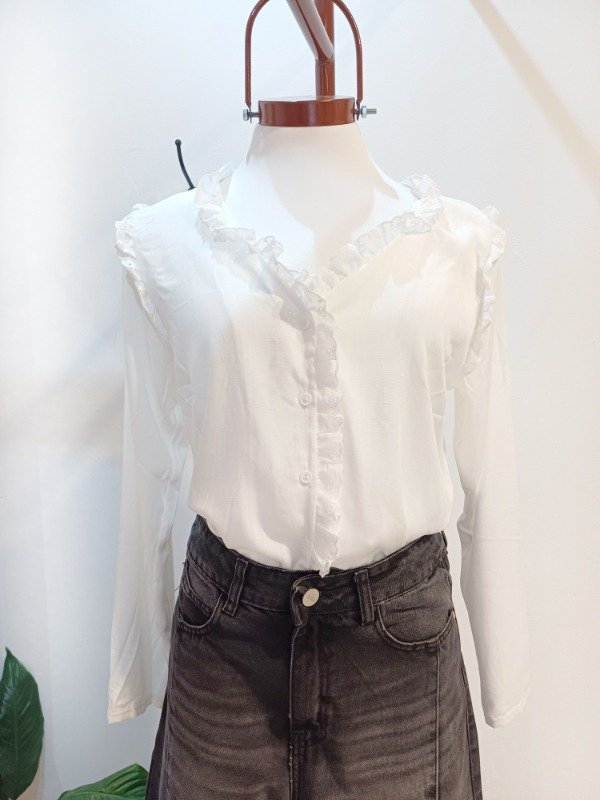 Camisa manga larga con cuello Mao con detalle de voladitos en escote y sisa .