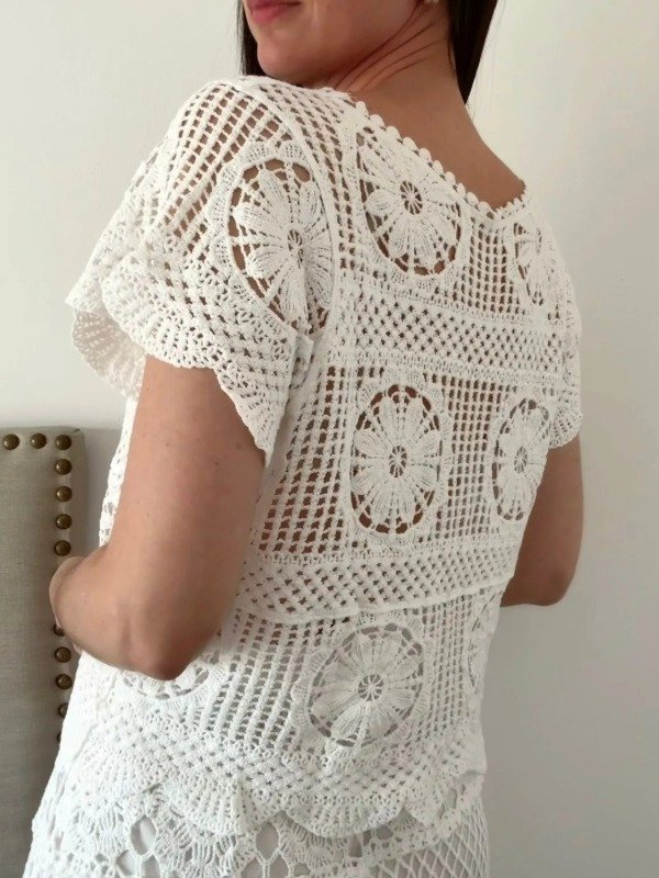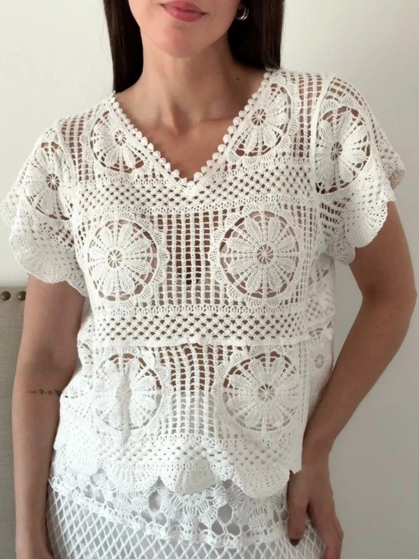 Remera cuello en v confeccionada en crochet ,tejdo mandala . Con mangas cortas y detalles de ondas en terminaciones