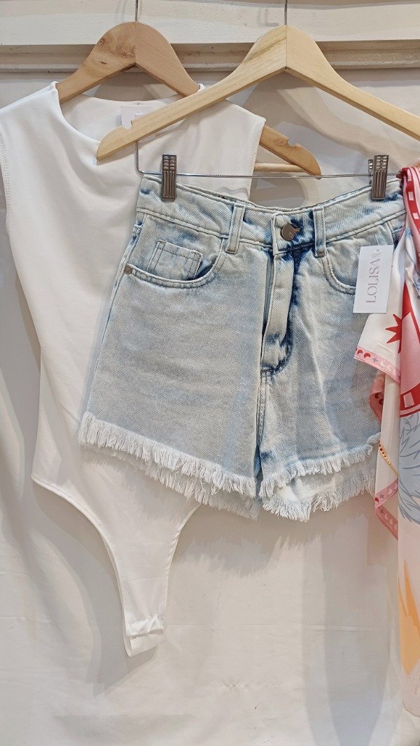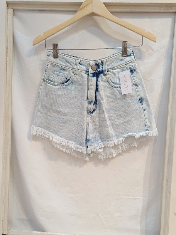Short tiro alto. Con ruedo desflecado, más curvo hacia los laterales. Confeccionado en bull cascarilla rígido.