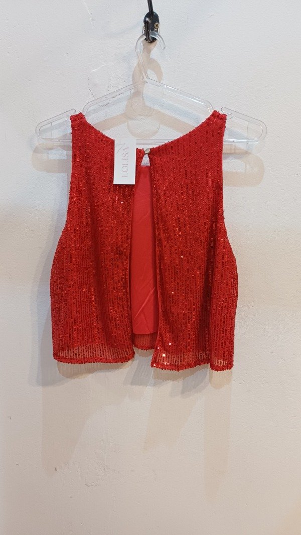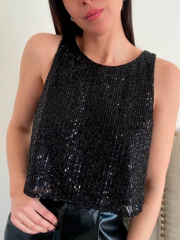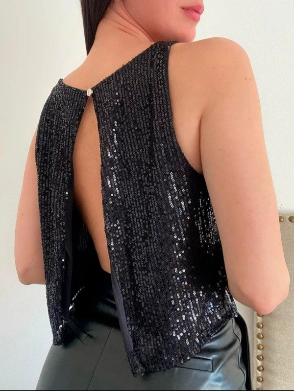 Top cuello redondo, espalda descubierta con detalle de boton , confeccionado en paillette con forreria interna.