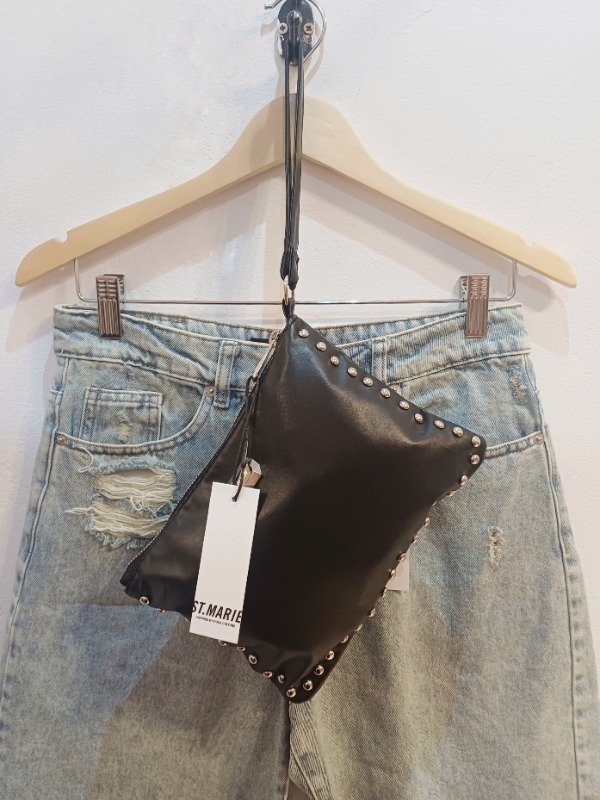 Sobre de gamuza 100% cuero con tachas en delantero y manija de mano. Tiracierre con logo y logo grabado en bajorelieve en espalda. Forrado con gross, posee bolsillo interno.