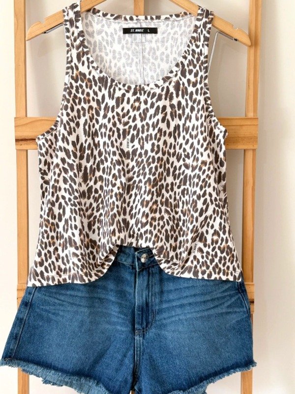 Musculosa de flamé, con escote redondeado, la tela está estampada con full leopardo. En el centro de su espalda lleva una badana con la inscripción de la marca.