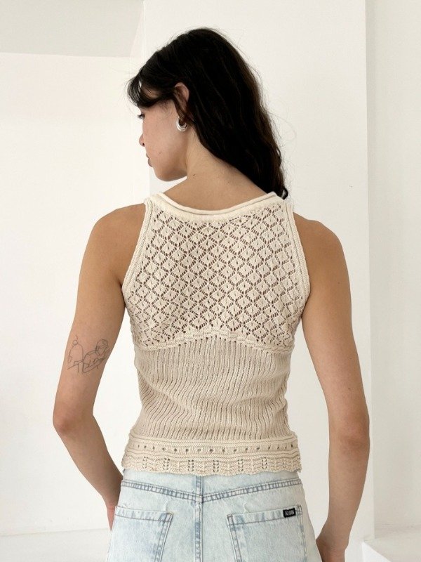 Musculosa de hilo de algodon calada ,cuello redondoy bretes anchos .