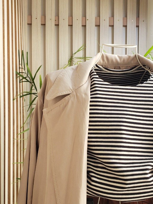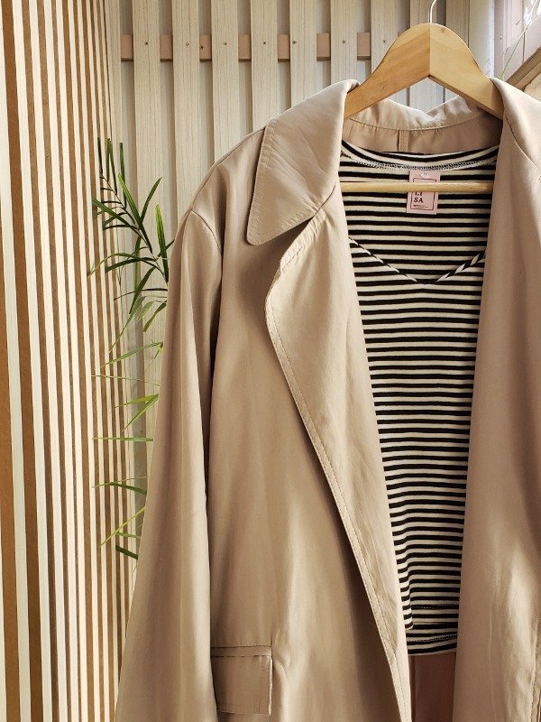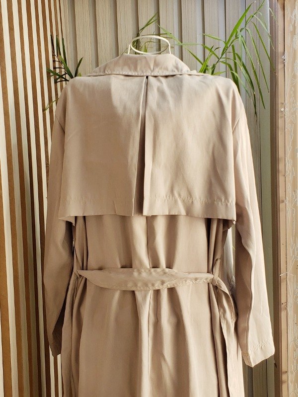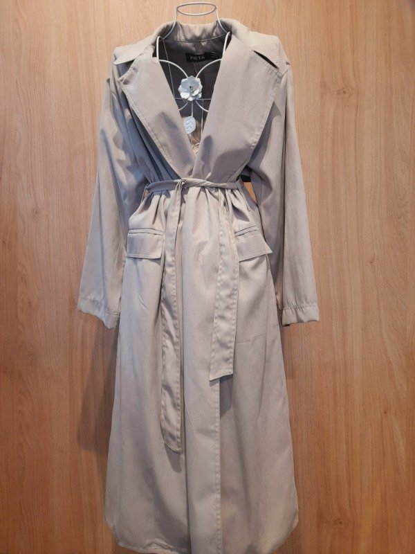 Trench largo con cinturón y bolsillos laterales.