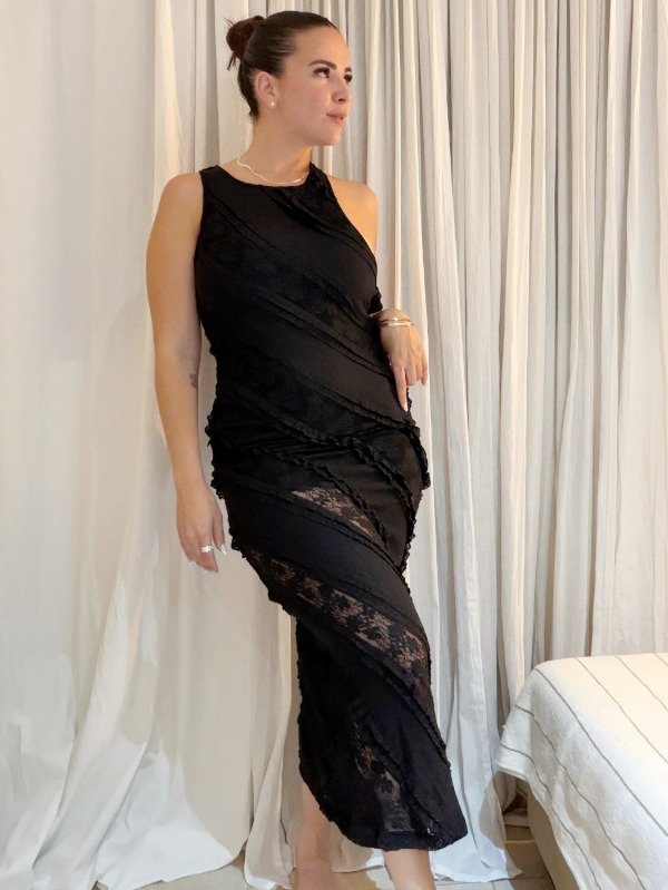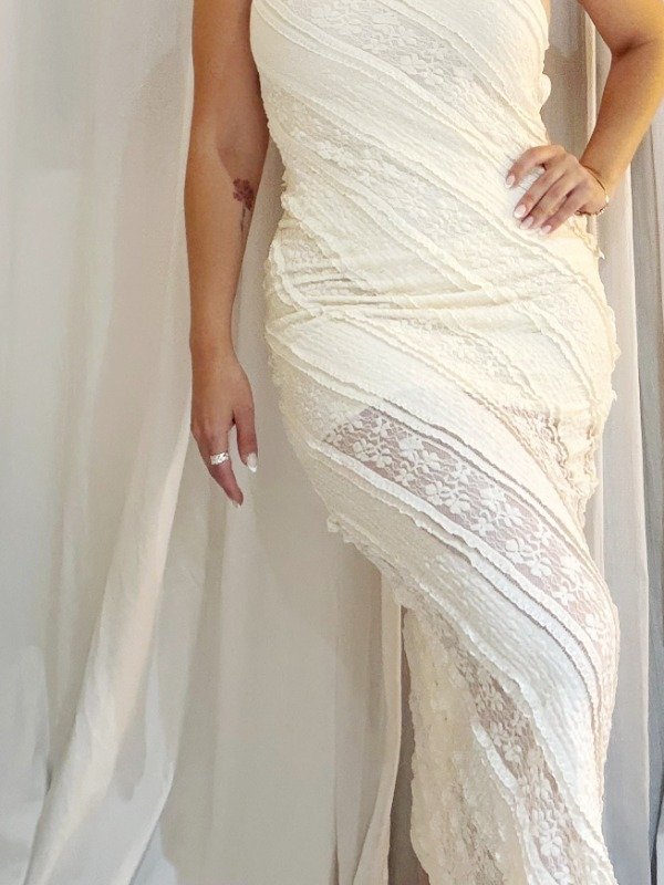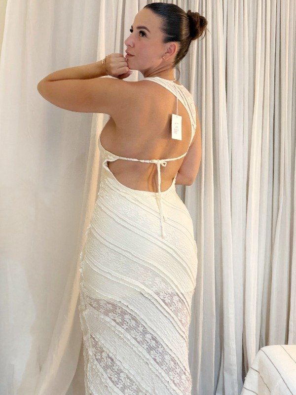 Vestido largo escote redondo forrado. Espalda asimétrica semi descubierta con tira de la misma tela que permiten anudarla. Confeccionado en encaje con spandex.