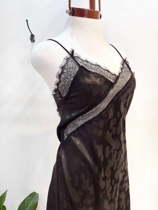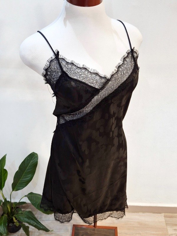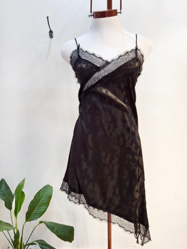 Vestido corto asimétrico con detalle de puntilla en escote.