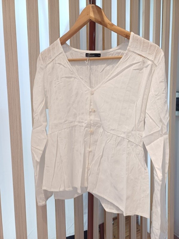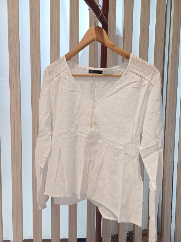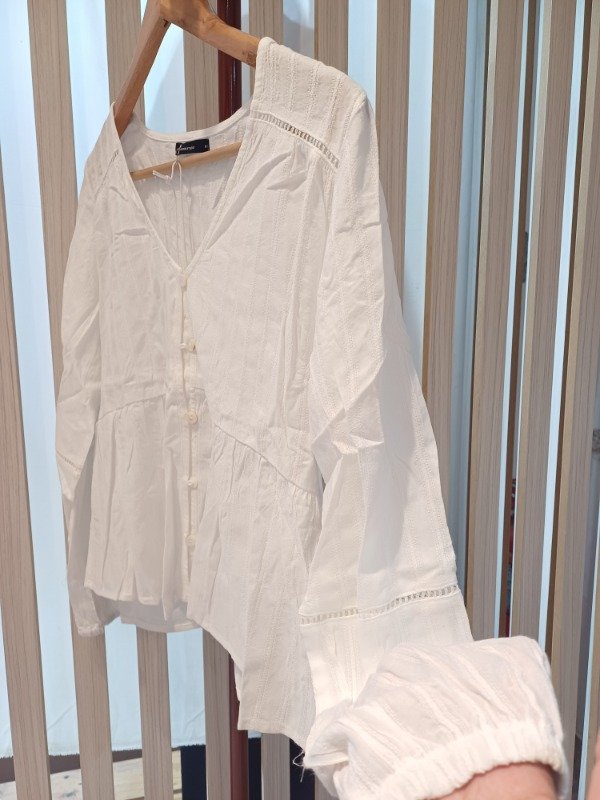Blusa manga larga escote V. Con vainillas en delantero y mangas, teminación de puños con elástico. Acceso delantero con ojalillos y botones de pasta.