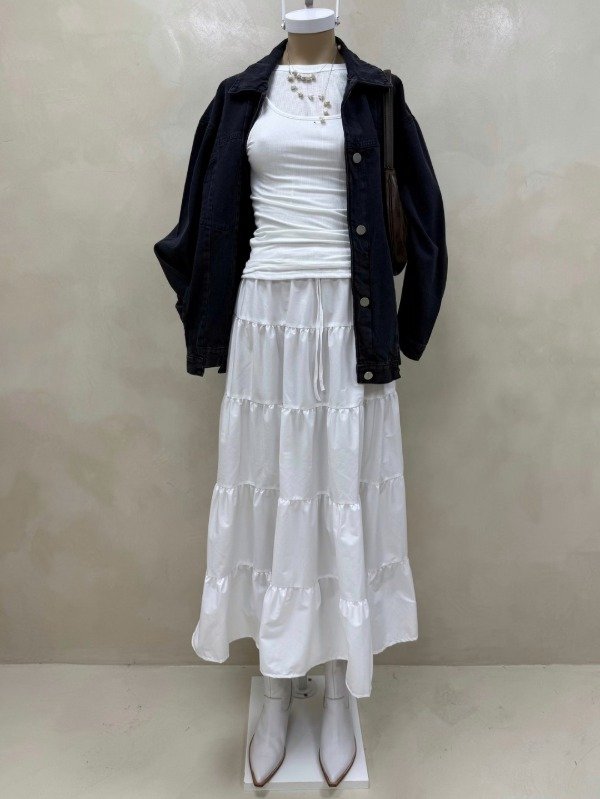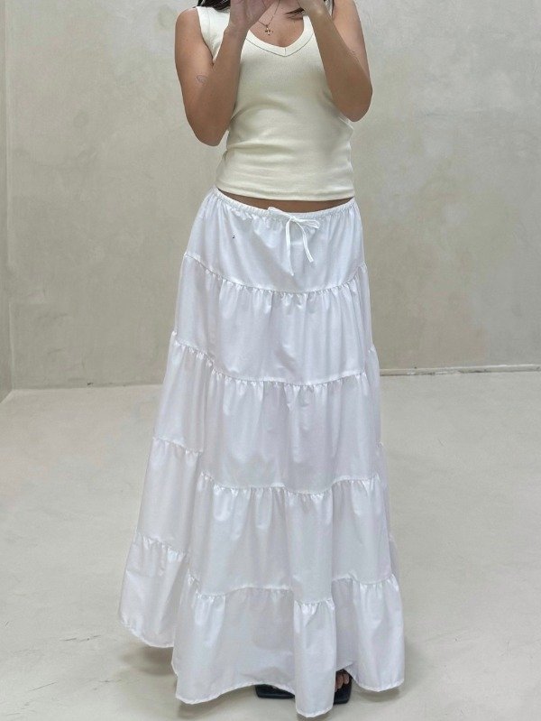 Falda larga con volados en delantero y trasero. Cintura con elástico y cordón de la misma tela. Confeccionada en Poplin.