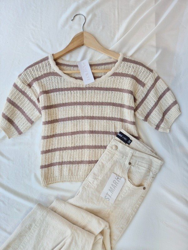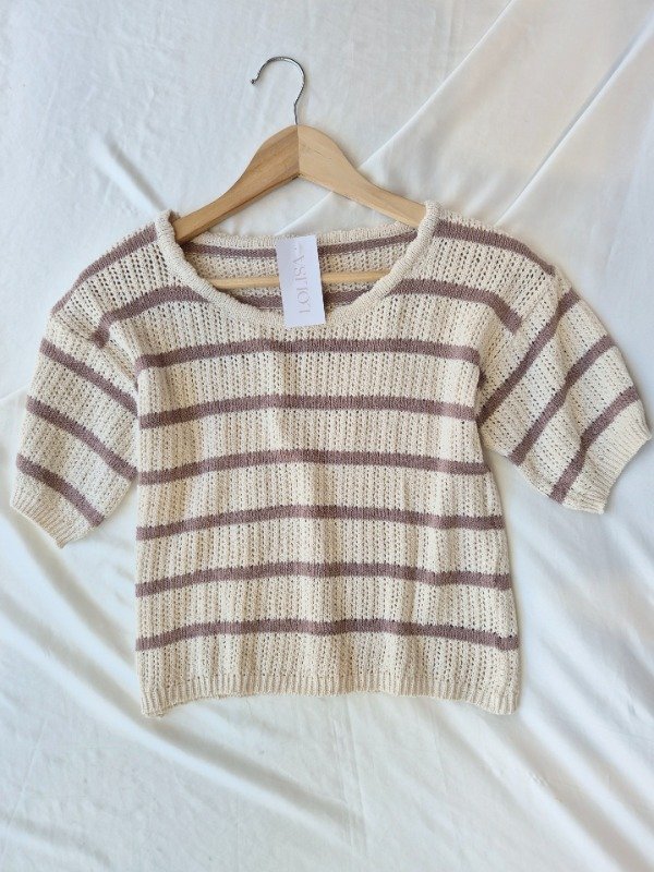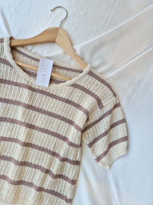 Remera de hilo de algodon manga corta , rayada . corte a la cintura .