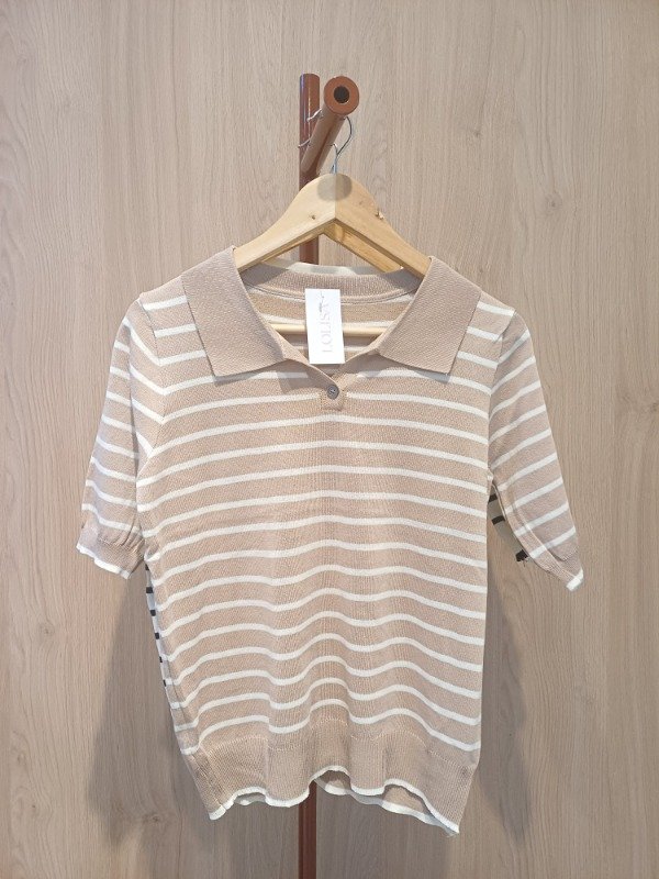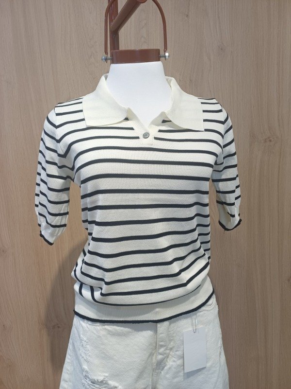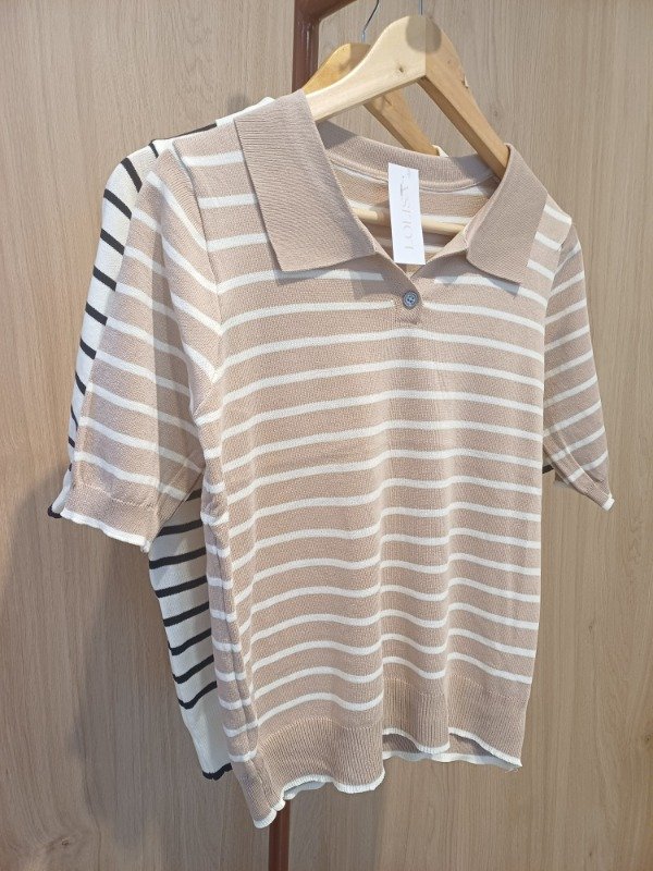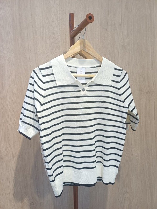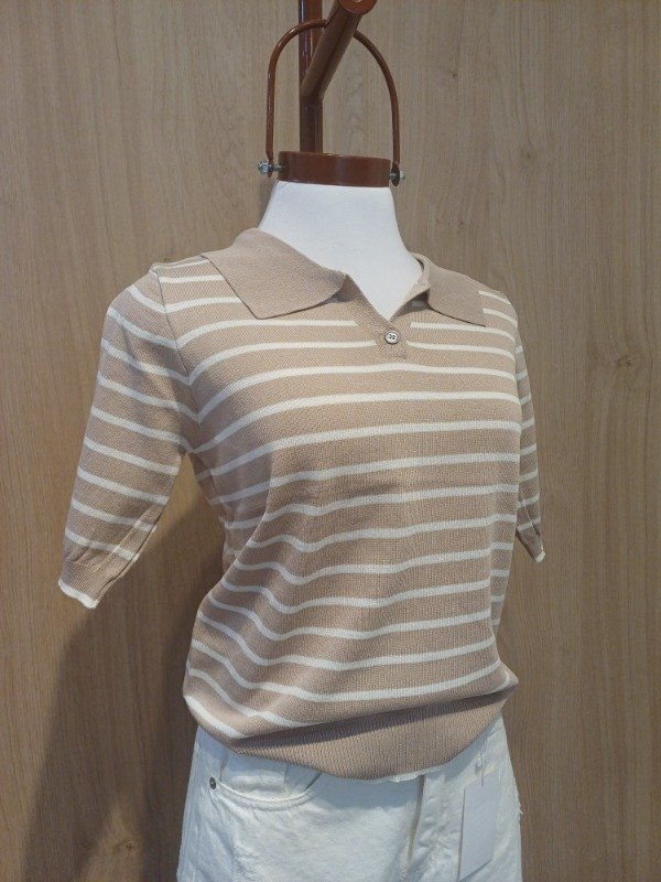 Remera de hilo mangas cortas , con boton y cuello ,tipo chomba . Detalle de vivos en puño y cintura a contra tono.