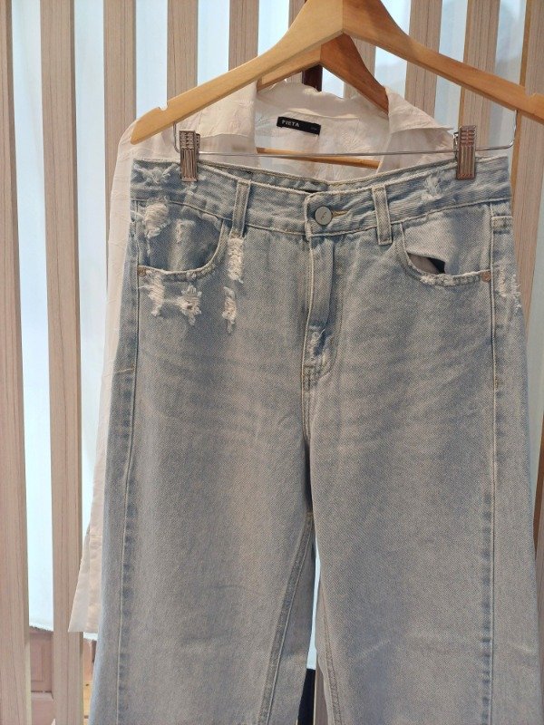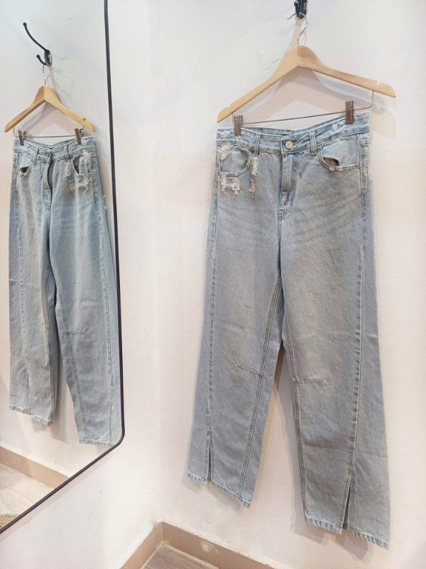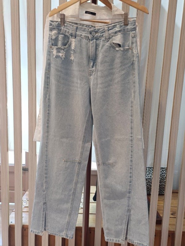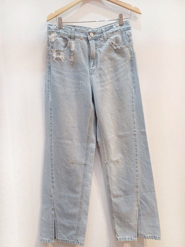 Jean barrel, tiro alto. Con pinzas en altura de rodillas y tajo en el delantero. Lavado celeste con roturas en el delantero y trasero superior. Confeccionado en denim rígido.